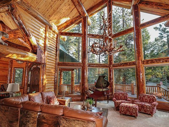 Located close the Village in Color Country this approx 5400 sq ft 5 bedroom 4.5 bath is the ultimate mountain home. Hand selected from Beaver mountain the cabin is abundant with bold 12"-24" hand hewn beams that are absolutely gorgeous. The open living room has the most impressive floor to ceiling windows that bring the beauty of the forest right inside to enjoy. Wood burning rock fireplace adds more ambiance to the already lovely setting. Entry through the stunning front door, this spacious floor plan opens to a divine kitchen with upscale appliances and granite countertops. Directly off the the kitchen is a most unique dining room with vaulted turret ceilings and an enormous dining room set. Main floor master retreat with office, bedroom with rock fireplace, sliding glass doors to deck and lovely bathroom with soaking tub. Entire upstairs is guest bedroom and bath. Lower level has large family room with rock fireplace, workout room ,laundry-storage room, mechanical room with water based floor heating the entire cabin, 3 bedrooms & 2 bathrooms. Great decks, asphalt driveway and big fire pit area. Lot is beautifully treed making for a true vacation in your mountain lodge.