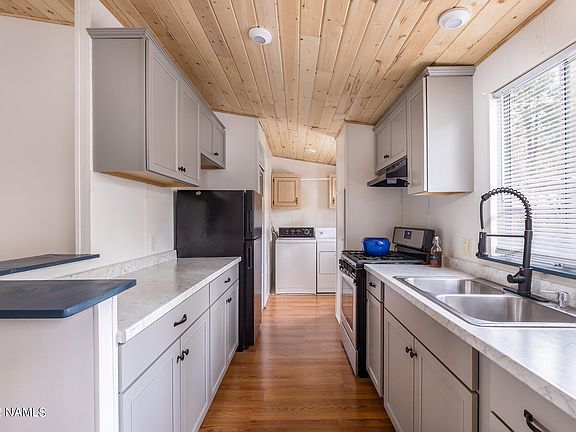 Beautiful Four Bedroom Doublewide Manufactured Home with huge, covered deck for entertaining. Vaulted T&G Wood Ceilings. Great Room with Split floorplan. Large Primary suite with bathroom. New PEX plumbing throughout. New paint inside & out. New upgraded kitchen cabinets and countertops. Wood laminate flooring throughout. Separate laundry room. Numerous Ponderosa Pines shade the property. Large lot with fenced yard and an ample storage shed. Don't miss this well-maintained home. Comes Furnished with a One Year Home Warranty.