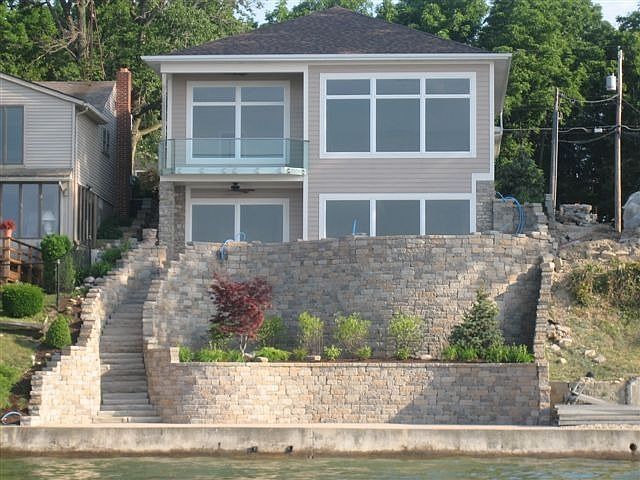 Everything one could ask for in a new home with 46 ft of lakefront on Clear Lk. And incredible far reaching views. All baths have tile flooring and granite countertops. The Gourmet Kitchen has custom built cherry cabinetry, granite countertops, a breakfast bar, and stainless appliances. The main level Master Suite is lakeside. The master bath has cherry cabinetry, granite countertops, a glass wall shower with a pebble stone feature wall and soaking tub. There are 12’ ceilings throughout most of the Main level and 10’ ceilings throughout the Lower level. The Lower level consists of a Family Room with gas fireplace, Kitchenette, 3rd Bedroom, Bath and Storage area. Professionally Landscaped with paver brick patio lakeside and stone paver steps to the lake. The home has Cement board siding, and stone feature on the front of this home, Owens Corning Premium Duration shingles and outside soffit lighting. A Back lot with a sewer tap is included.