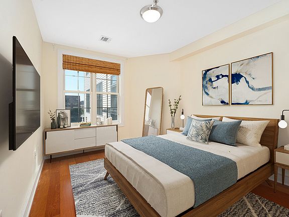 Gorgeous South facing 2 bedroom/2 bath apt in an elevator building with parking space included! This fourth floor apt gets amazing natural sunlight with high ceilings and brazilian hardwood floors throughout. Modern open kitchen boasts granite counters, stainless steel appliances, tons of cabinet space and breakfast bar. Spacious living room features floor to ceiling windows, juliet balcony, crown molding, and recessed lighting. Primary suite bathroom is appointed with a double wide marble vanity and subway tiled shower, while the large walk in closet has custom built-ins throughout. Second bedroom is on the opposite side of the home and also features a good sized closet with custom shelving. Central air, and washer dryer in unit complete the home. Building has a fitness center, common courtyard, and on-site garage. Located just steps from the 9th Street light rail, commuting to the city is a breeze! Great location close to the Monroe Arts Center, ShopRite, and a new park! Nice sized covered parking space is included. If parking isn't needed, rent will be $4050. Available April 1st! Please do not inquire if you are looking for "corporate housing" or airbnb. Water/trash/sewer included. Security deposit is 1.5 month's rent and broker fee is 1 month's rent. Pets may be approved on a case by case basis.