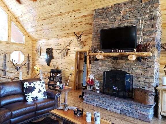 This gorgeous Chalet style cabin w/ pop outs on both sides. Main floor has large windows with floor to ceiling rock fireplace. Great open floor plan. Two levels with the Master on the main floor, which features a 2 person dry sauna, garden tub in Master Bath. Kitchen features all appliances including a wine cooler, trash compactor, granite counter tops. Built in oven also has second warming drawer. Fireplace has a heatilator for those cold mornings. Ceilings & most walls are Aspen which is very sought after and beautiful. Downstairs are 2 more bedrooms as well as a full bath, Laundry room/Mechanics room. Pool Table stays if desired. Upgraded Lighting and bath fixtures throughout. Swains Creek subdivision features a private "stocked" pond as well as private airport runway and horse corrals available for its owners. This property boarders National Forest so your back yard is truly your playground. Too many features to list its a real must see. PROPERTY CONTINGENT ON TIME CLAUSE