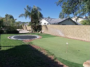 This home has an open floor plan that flows quite well. There is tile and carpet throughout. The kitchen has granite counters with miles of storage cabinets and more than enough counter space for any size meal you are going to prepare. This kitchen is a must see. Private dining area adjacent to kitchen.Large family room with plenty of space and working fireplace. Master bedroom has spacious bathroom and a closet that can challenge the largest of wardrobes. Large spacious rooms with plenty of closet space. The backyard is an oasis of entertainment. There is a putting and chipping green for the avid golfer. The trampoline is always a crowd pleaser and the pool is right next to it for that cool down dip after some jumping. As if that wasn't enough there is also a basketball court for your sporting entertainment. This home has it all.