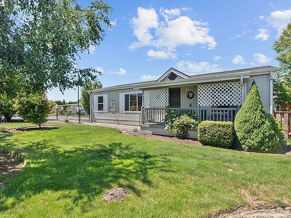 Stunning 3 bed, 2 bath Fleetwood manufactured home in Mt. Angel’s Bavarian Village all-age park. This all-electric home sits on a spacious, beautifully landscaped lot and features a covered front deck with gorgeous views of Mt. Hood. Inside, enjoy a split-bedroom layout for added privacy, open-concept living, and heating/cooling for year-round comfort. The fully equipped kitchen includes a high bar island, and durable laminate floors run throughout the main living areas and primary bedroom. The primary suite features a walk-in closet and walk-in shower. Outside, you’ll love the fenced yard with a paver patio, charming garden house with power, and additional shed tucked at the end of the carport. Walking distance to local dining, shopping, and more! Welcome home!