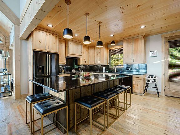 Nestled in the gated community of Blue Ridge Heights, this stunning mountain home offers unparalleled panoramic views of the surrounding mountains. Just 2 miles from the charming historic downtown of Blue Ridge, this 4-bedroom + bunk room residence boasts a master-on-main with an en suite bath and upstairs master with a spacious private balcony. The expansive wrap-around decks provide an ideal setting for outdoor dining and entertainment, while the family room features a fireplace, wet bar, shuffleboard, and pool table for endless enjoyment. The dramatic kitchen, complete with Zline black stainless steel appliances and a large island, creates a perfect gathering place for both cooking and socializing. The chef's kitchen includes a coffee bar with a wine chiller, catering to the needs of those who appreciate both luxury and practicality. The property also offers the potential to build a detached garage, adding further convenience and value. With breathtaking mountain views from every room, this home seamlessly blends the beauty of the outdoors with the comfort of modern living.