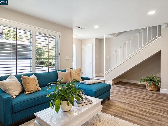 Nestled in the heart of Westside Danville, this charming duet home offers unparalleled convenience, situated mere moments from Downtown Danville. As you step beyond the inviting front lawn, you will notice laminate flooring, shutters gracing the dual pane windows, and recessed lighting throughout the downstairs. The open living room is anchored by a classic brick fireplace and seamlessly transitions into the dining area with access to the backyard. The white kitchen features quartz countertops, stainless steel appliances, ample cabinet space, and a garden window looking into the backyard. Adjacent to the kitchen lies a half bathroom and a laundry enclave. The fully fenced, low-maintenance backyard offers artificial turf and a tranquil patio beckoning for al fresco dining. Ascend the staircase to discover the upper level, where two well-appointed bedrooms await. The front-facing bedroom boasts two closets, while the rear-facing bedroom has dual mirrored closets and grants access to a private deck. There is also a full bathroom on this level. This home has a one car covered carport including a spacious storage closet, supplemented by an additional parking space. This prime location boasts proximity to top-rated schools & convenient access to the freeway. HOA covers water & trash.