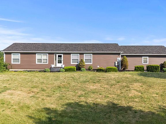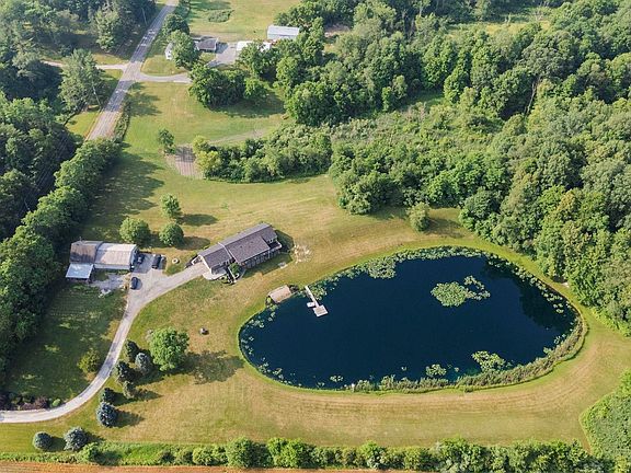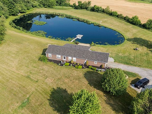Coming Soon! Updated photos coming. Beautiful 6.6 Acre property featuring a 2 Acre pond, 1560 square foot ranch on a full finished walk-out basement, and 2 outbuildings. Open upper and covered back patio stretches the length of the house. Makes perfect for a little personal relaxation or private gatherings overlooking the pond and natural backdrop. Recently updated main level front and patio doors, windows, a majority of the flooring. 3 bedrooms and 2 full bathrooms on the main level. Walk-in ceramic shower in the master suite. Walkout lower level has open rec space, 4th bedroom and half bath. All appliances will remain excluding the (2) deep freezers. Main structure roof and water softener installed 2023. Well pump installed 2022. Geothermal installed 2020. Little 8 x 10 log cabin in the wooded area beyond the pond.