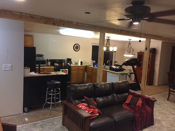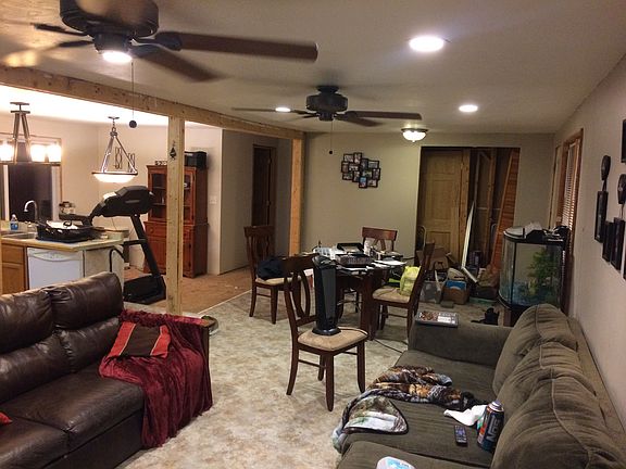 Sitting on a full cement pad. Completely gutted 3 years ago. Walls studded out to 6". R18 Insulation in walls, R38 ceiling. All new electrical from pole throughout house. 200amp entrance. Drilled well (roughly 80'). Roof (tin), windows (double pane), Septic and furnace new 8 years ago but house was vacant for 5 years before remodel. Currently designed as a 2 bedroom 1 bath with built in closets and kitchen pantry. Could be turned back into a 4 bedroom easily. Master bedroom is 12x24 with his and hers closet (2.5x10'). Small utility room holds 40 gallon electric water heater and pressure tank. Has a open floor plan. Living room/entrance is roughly 12x26. Recessed lighting and dual ceiling fans. kitchen/dining area roughly 12x24 with a 2.5x9' built in pantry. Bathroom (12x12) has a new stand up tub/shower unit with Washer and dryer located in bathroom. Monitor heat in main room and also master bed. Smaller bedroom has built in electric. Large paved driveway takes up the front yard. Leaving a large private backyard. Does need to be finished but certainly livable as is and is occupied. Work needed: flooring installed in bath/kitchen (have material to do so but was waiting until bought new kitchen cupboards). Inside closet walls (currently bare studs). Master bed flooring. Molding/trim around windows/doors. Outside needs updated vinyl siding/tin. 24x20x10 garage: 6" walls R18 insulation and painted OSB on walls. Needs to be wired and could use new doors. Does have an addition that is fixable but suggested to be torn down.