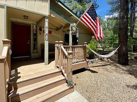 Situated on a rare, creekside, 1/4 acre corner lot in Munds Park's most desirable area; walking distance to Lake Odell and Pinewood Country Club. This single level, 3 bedroom, 2 bath cabin is the perfect private retreat. Features include an open floor plan, vaulted ceilings, brick-surround wood burning fireplace and wood burning stove, wood laminate plank floors and huge master suite. Approx. 1720 sq. ft PLUS an enclosed sunroom (additional sq. footage) leads to the outdoor wrap TREX deck that overlooks the spacious, lush backyard and seasonal stream. Detached 2 car garage, metal roof, double pane Anderson windows makes this charmer move-in ready for year-round living. This private family getaway has been lovingly updated, maintained & never been a rental. TOO MANY UPDATES TO LIST! Call for your private viewing. (Buyer to verify ALL facts & figures)