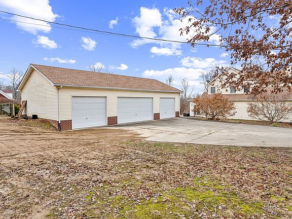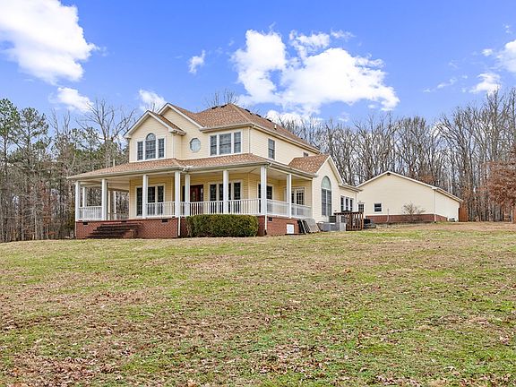This expansive 2,891 square foot home, situated on 13.21 acres, boasts vaulted ceilings, abundant hardwood flooring, and large windows showcasing country views. A substantial wraparound covered porch, and a detached 4 car garage are also featured. Spacious island kitchen includes a breakfast nook and all appliances. Formal dining room and generously sized living room with fireplace. Main level primary suite with vaulted ceilings and primary bath featuring dual vanity sink areas, handicap accessible tub and walk in shower. Walk in laundry room with storage cabinetry. Upper bonus room would be ideal for exercise area, family room or playroom.