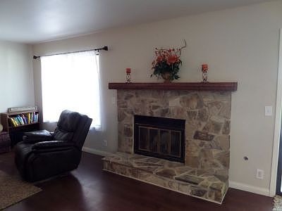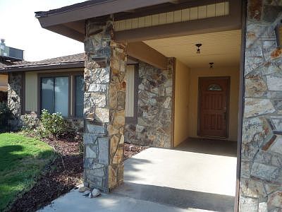 Ripley Estates home w/ generous lot plus RV area. Covered porch leads to large entry hall with view of magnificent rock fireplace w/ gas lighter. 8 millimeter thick laminate flooring throughout except tiled floors in both remodeled bathrooms & kitchen. Huge living room features crown molding & view of backyard. Kitchen has recessed lighting, new dishwasher and range; tiled counter & breakfast bar. Open to gigantic dining room to feed the whole family and one wall of storage. Both bathrooms were gutted to studs & rebuilt to code w/new tile, tub, shower pan:beautiful! All 3 bedrooms have fans. Large master suite faces North w/ view of backyard and custom tiled shower. All ceilings have been scaped & textured. No Popcorn! Grassy back yard has long covered patio; featuring rocked in gas spa for stargazing.Oleanders, palm trees, & wisteria. Dual pac & new 7500 cfm evap eave mounted. Shed.Garage has laundry area & shelving.Roof approx. 9 yrs old.