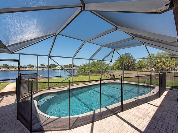 AMAZING VIEWS! STUNNING estate perfectly situated on an almost 1/4 ACRE lot overlooking the water! This 3 bedroom, 2 bathroom, OVERSIZED 2-car garage POOL home showcases breathtaking VIEWS from the entire back of the home. This magnificent home sits on the water within Port Charlotte, where you will enjoy fishing off the DOCK, boating, or watching the most AMAZING sunsets!! This UNIQUE abode offers a floor plan that is OPEN & efficient, wasting no valuable space with a perfect blend of open & formal space great for entertaining. Uncompromising elegance, masterful design, superior craftsmanship. Showcasing SOARING VAULTED CEILINGS, and a RENOVATED interior, this home is absolutely PERFECT! The CHEFS KITCHEN offers GRANITE counters, DOUBLE ovens, STAINLESS STEEL appliances, a breakfast bar, a COOKING ISLAND with a glass cook top, all of which overlook the family room, and the ENORMOUS DOUBLE SLIDING GLASS DOORS that overlook the water!! The HUGE master bedroom offers lots of space, and features GLASS SLIDERS that lead to the pool, as well as an EN SUITE BATHROOM with DUAL VANITIES, and a WALK-IN SHOWER. The additional bedrooms boast ample space, are bright, and are easily convertible, which allows this home to be extremely multi-functional! All-year fun is a MUST with this homes INCREDIBLE outdoor space!! A SCREENED-IN patio encompasses a SPARKLING POOL that overlooks the DOCK and WATER, making this home the BEST place to entertain friends and family. BONUSES include: NEW interior paint, NEW exterior paint, NEW roof (2021), NEWER A/C, NEWER, pool pump, and a NEWER irrigation pump!! In addition to everything else, this home is located in the PERFECT place, close to shopping, dining, services, entertainment, and SO MUCH MORE!! Dont miss the ONCE-IN-A-LIFETIME opportunity to be the new owner for this FANTASTIC abode.