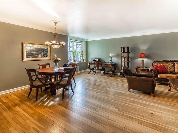 One of the nicest units with top of the line finishes. Beautiful kitchen with custom cabinetry, granite countertops, tile and glass backsplash. Quality stainless appliances. Open concept spacious Living / Dining...great for entertaining. 2 good size bedrooms. View of the Hudson River & Uptown NYC Skyline. Sunshine galore. Crown moldings, custom radiator covers. Beautiful wood floors. Great closet space. 2 floor model air conditioning units (included) cool the apartment. Complex has a gorgeous pool / kiddie pool / picnic area with amazing views of the Hudson River (use included in maintenance fee). Gym available for a small annual fee. Children's play area. Beautifully maintained grounds. Onsite management. Storage also avail for a small monthly charge. NYC bus and private bus service is at the door. NY Waterways Ferry Bus Shuttle Service to Weehawken Ferry also avail. NYC bus and private shuttle busses @ the door. Across from beautiful North Hudson Braddock Park with lake for fishing, trails for jogging/walking around the lake, tennis courts, Bocce courts, handball courts, large playground with summertime water elements, picnic areas, basketball courts, baseball field and more. Short distance to bustling shopping district of Bergenline Ave for restaurants and every product and service one could want, including a Post Office open until 7 p.m. Monthhly Maint of $1,372 inclds heat/hot water/water/sewer/grounds maint, elevator maint, janitorial salaries, bldg. insurance, reserves for future repairs, snow removal, trash removal, bldgs common area maintenance/cleaning, POOL, REAL ESTATE TAXES and is almost 50% tax deductible. Pet friendly complex.