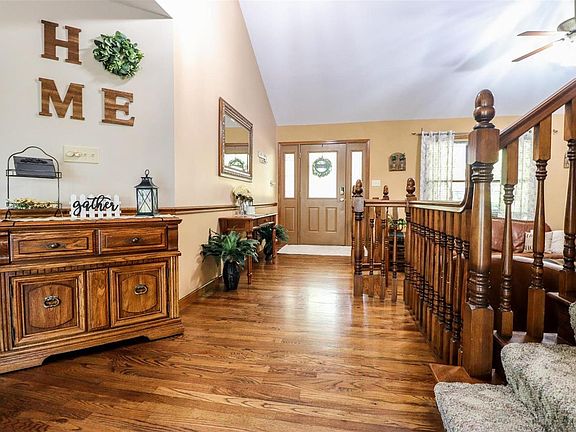 This atrium 1.5Story Cape Cod is on almost 2 acres with open floor plan,hardwood floors & huge dining room.Dramatic 2story entry, sweeping open staircase to upper family room.Lower level will be perfect for entertaining or in-law suite. Vaulted MBR has luxurious bath,whirlpool tub & shower with seat.Cozy living room/den has impressive brick to ceiling fireplace and built-in bookcases.A favorite area may be the 4car garage with finished peg-board walls,shelves,workbenches & epoxy floors.Exquisite concrete stamped circle driveway adds to the appeal of this wonderful home.The kitchen is the heart of the home with planning desk,center island cooktop & downdraft exhaust fan,plant window,appliance garage,glass front door cabinet & double ovens.Pretty laundry/mudroom between kitchen & garage.Part of yard fenced for pets and surrounding ground for kids to play and explore. About 1400 sq ft of unfinished basement for storage with separate outside entrance,stairway from garage & storm shelter.