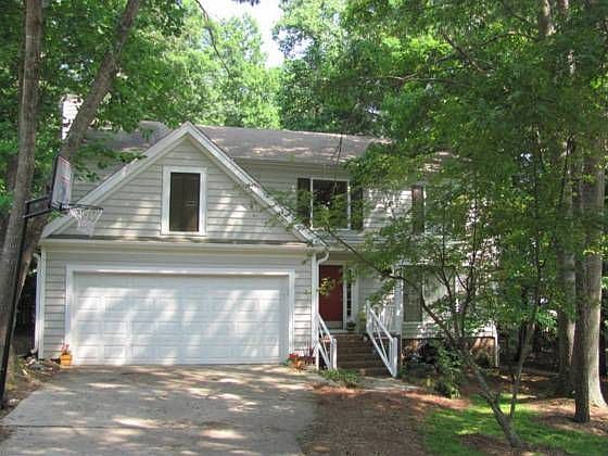 Cul-de-sac lot in North Raleigh. Four bedroom two and one half bath with two car garage. Approximately 2300 square feet. Two story entry foyer. Formal living and dining rooms for entertaining. Dining room with bay window accent. Stunning hardwoods in foyer, kitchen, dining and breakfast. Kitchen with granite counter tops, tumbled stone back splash, black appliances open to breakfast nook. Large family room with fireplace and door way to deck over looking fenced back yard. Upstairs a huge mast...