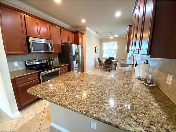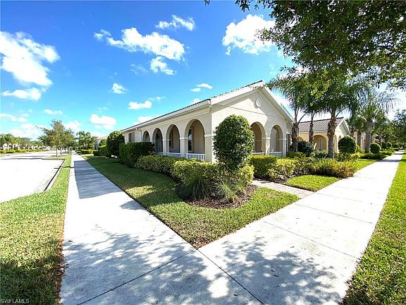 This home is one of five Kendall models built in VeronaWalk. It is located on a corner lot with a stunning large lake view. You will be charmed as you step up to your full glass door from the covered, paver front sitting porch. The three bedroom/ two bath single family home is being offered with its comfortable furnishings. Tile has been laid on the diagonal in the main living spaces and the ceilings are wrapped in crown molding for an elegant yet contemporary look. The bedrooms have cherry wood flooring offering a nice contrast to the tile. Your eat in kitchen is fully updated with burnished wood cabinetry, granite counters, tile backsplash and a trio of stainless appliances. The master bath is nicely appointed with a granite topped dual sink vanity and a step in shower with frameless glass shower enclosure. Outdoors is a restful screened paver lanai surrounded by a grassy lawn. You also have a two car rear load garage allowing for ease of access. This immaculate home is bright and ready for new owners.