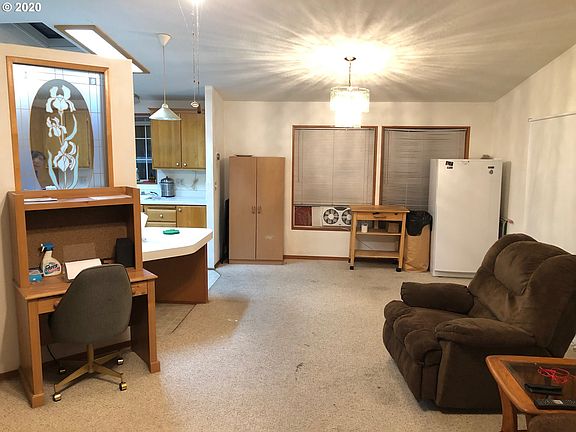This home gives a grand appearance from the outside with abundant of natural lighting coming in to a large living room. 2 large bedrooms, 2 full bathrooms ,laundry room area, and kitchen w/ lots of cupboards and storage. Heat pump cooling system included. Refrigerator is included. The exterior is freshly painted and includes a ramp build a long the carport. Low maintenance yard. Large work shop. Park monthly space rent $750.00