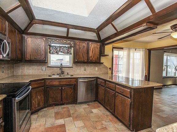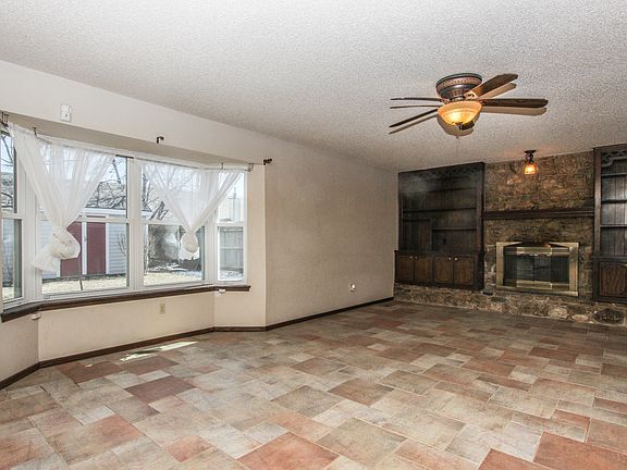 Charming House located on a Corner Lot with Brand New Paint and Carpet! This HUGE home features 5 bedrooms and 3 full bathrooms. The living room boasts an eye catching wall to wall masonry fireplace with built-in bookshelves, ceiling fan, and sitting area next to a bay window! The kitchen has a breakfast bar, stainless steel appliances, ample cabinets, and granite counter tops! The dining area would be a great place for entertaining. You will find 2 bedrooms complete with ceiling fans downstairs, as well as a full bath. The spacious Master Suite is upstairs and has a private bath. The 4th and 5th bedrooms, both complete with ceiling fans, are located upstairs along with the 3rd bathroom. Enjoy family time or cookouts on the covered patio. The backyard is fenced and the 10x14 storage building stays with the property! There's even a storm shelter and 13 month home warranty! This home has big potential and is awaiting some personal touches! Come see today.