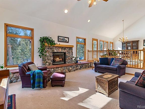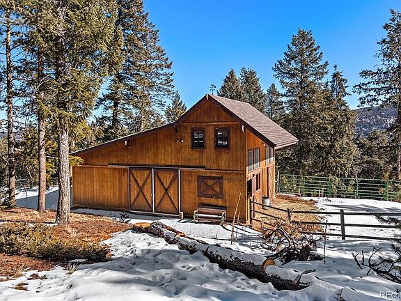 This charming custom built home is nestled on 10 acres at the end of a private cul-de-sac. This home was architecturally crafted to capture the southern sunlight and warmth with its passive solar design. Featuring two-story vaulted ceilings, abundant windows, a cozy river rock gas fireplace and open concept floorplan. The master suite boasts four closets, a private bath with dual sinks and a relaxing soaking tub. The main level office offers extensive built-in bookcases surrounded by gorgeous sunny windows. The main level steps out onto a beautiful back flagstone patio. The upper level boasts two bedrooms sharing a Jack-n-Jill bath and a large family room with an ensuite bath. This is a legal horse property with a 24x36, 2-stall barn with water, hayloft, round pen, corral and two pastures in the woods. This property is located just outside the Evergreen Meadows Subdivision, so technically not in the HOA and is only 10 minutes to grocery shopping in Conifer and a 5-minute horse trailer ride to the 422 acre Flying J Ranch Open Space Park.