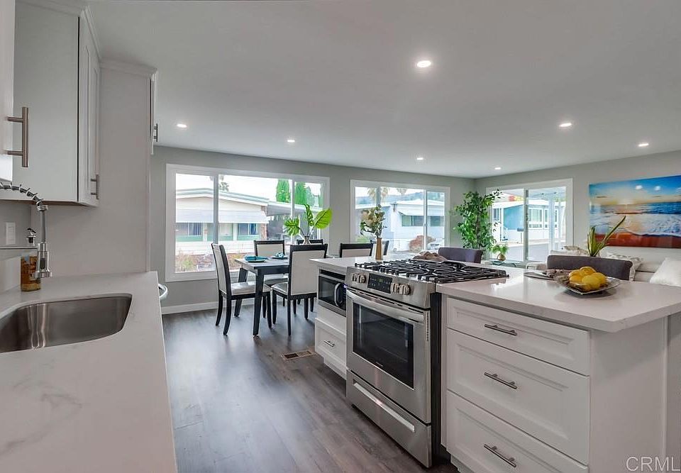 Santee Living at its Finest! Welcome to The Meadowbrook, Santee's Premier Senior Mobile Home Park. This newly remodeled 2 bedroom, 2 bath home features an Open Concept with large Dual Pane windows. Step into the kitchen with its quarts countertops, stainless steel appliances, soft close drawers, recessed lighting and laminate flooring throughout. Guest Bath has a Shower/Tub combo. The Main Bedroom features a Walk in Closet. The Main Bathroom has a Gorgeous tiled shower with Rain shower head and built in bench with a hand held shower wand close by. New Heater and Newer AC Unit. The front porch is perfect for sitting and enjoying your beverages. The backyard has new Vinyl fencing which is perfect for privacy and pets. The large Shed with its 2 locking doors is great for a hobbyist or storage. Meadowbrook is an active Senior Community with many amenities such as Heated Pool, Jacuzzi, Sauna, Billiards, Ping Pong, Horse Shoes, Shuffleboard, Putting Green, and a Clubhouse with many planned activities. Close to Freeways and Shopping, with Parks and Hiking Mountains nearby.