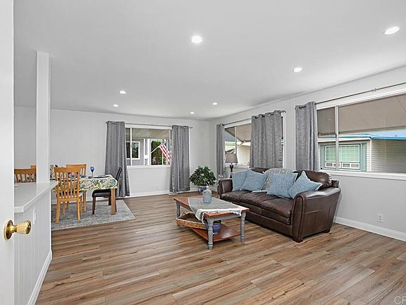 Beautifully renovated Meadowbrook home!! This is a premier 55 and over park in Santee. This refreshed home provides an open and airy floor plan with laminate vinyl planking, a new kitchen, quartz coutertops, stainless steel appliances, recessed lighting, freshly painted interior, a new rolled roof, upgraded bathrooms, interior laundry area, central air and heat, an enclosed patio room, and much more!!! Meadowbrook has many amenities such as a swimming pool, putting green, shuffleboard area, clubhouse and plenty of organized activities. All buyers must seek approval from the Park Office.