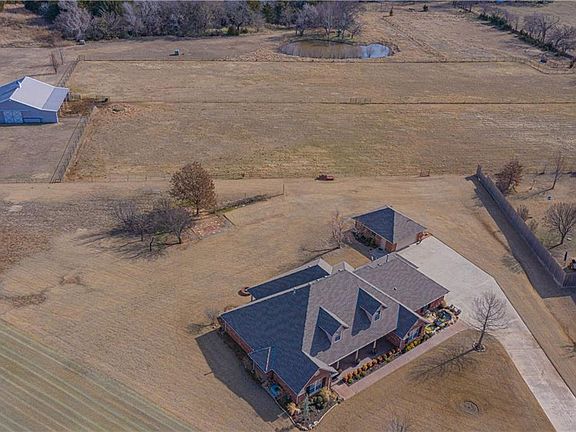 Wow! This STUNNING HOME is located in a very peaceful neighborhood in the coveted Wheatland Estates, at the end of the cul-de-sac, on a lovely 1.35 acres with grazing horses as your view from your back porch. Even with the unbelievable setting, this home is extremely convenient to shopping in S. OKC, Mustang,& take the Turnpike easily to NW OKC! This well cared for one-owner, custom-built home, boasts 3 large bedrooms, each with their own full bath en-suites. A warm study with beautiful hard-wood floors and built-in cabinets and shelves. The open floorplan invites a beautiful yet functional formal dining, living and kitchen area with high-end stainless steel appliances, great for entertaining. This home has a theater room upstairs with actual vintage theater seats, a projection screen with surround sound and mini-kitchen. Perfect for friends and family. A 3 car attached & 2 car detached garage, large covered front and back porches, central vacuum, plantation shutters and so much more!