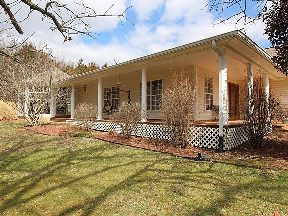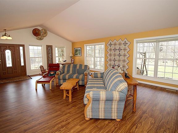 This serene horse property is located on 12 acres of pasture & woods. The beautiful ranch style home is privately positioned at the of the lane. As you step onto the wrap around front porch, you will enter into a large vaulted great room that is open to the kitchen, complete with a center island. The natural wood look of the new vinyl plank flooring is impressive. Adjacent to the kitchen is the dramatic octangular dining room offering a panoramic view. The spacious master suite has a built-in armoire that flanks the bed plus a bay window & 2 walk-in closets. The luxury master bathroom has a jacuzzi tub & separate shower. The 2nd bedroom will inspire with a stunning Palladian window that soars to the vaulted ceiling. The main floor laundry/mud room leads to the oversized 3 car garage. There is also a 1 car detached garage/workshop & a 220 volt outlet for RV parking. For the horses there is a 3 acre fenced pasture, 30x12 Barn w/2 stalls & hay room, a paddock, additional pasture & a pond.