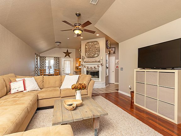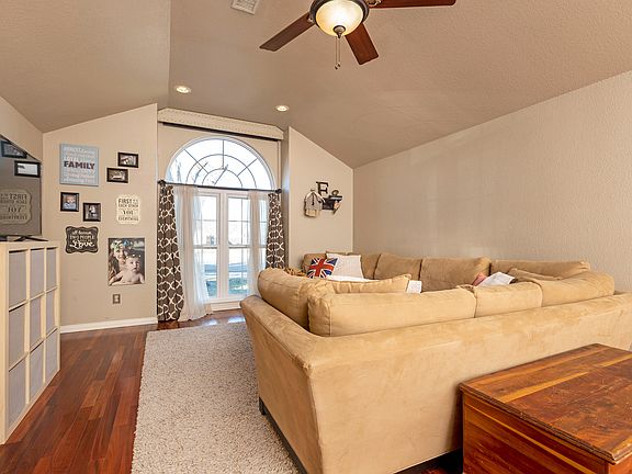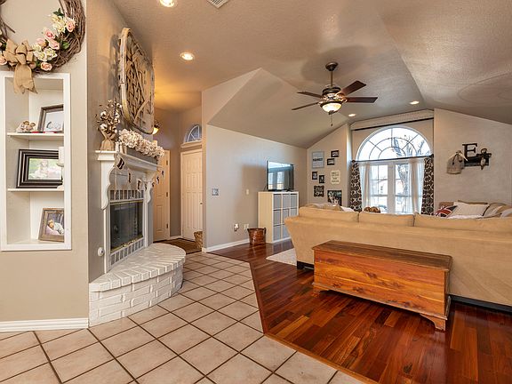 Textured walls with a beautiful calming color palette. Granite counter tops in kitchen and both baths, Brazilian Koa hard wood flooring and tile, with white subway tile in front bath, cast iron clawfoot tub in master bath with ten foot ceilings and a huge skylight over the tub! Walk in closet with built in shelving. Brand new Kohler toilets, glass tile back splashes in both bathrooms. Two car garage, tornado shelter with power, slab for hot tub ready with wiring. BRAND new Daikin Fit HVAC system which can be run from your smart phone no matter where you are in the world! Watch a video on the Daikin Fit on youtube, it's amazing! GORGEOUS brick fireplace, can burn wood but we have fire glass installed. Ten foot ceilings throughout except for two of the three bedrooms, which are 8 feet. Back patio is quiet and you can walk to the end of the culdesac and feed the horses any day of the week. Such a peaceful place to live. Comes with one year old GE washer and dryer, stainless steel fridge, stove, and dishwasher and microwave. HVAC was installed Sept 2019! Sprinkler system front and back. There is also a dedicated 30 amp plug inside the garage for your RV! Permanently installed gun safe.