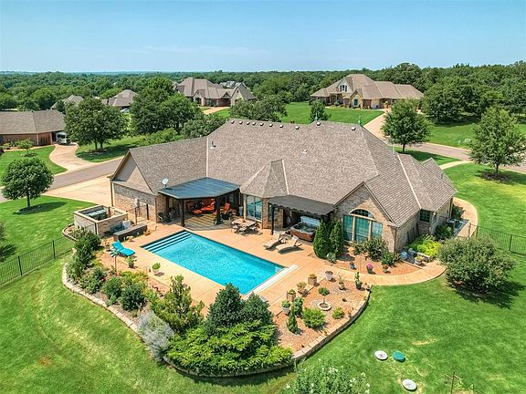 The 1.4-acre partially fenced lot features a saltwater pool, hot tub, and two pergolas, adding to the outdoor appeal. An in-ground storm shelter in the garage is an added safety feature. This location gives you the peace and quiet of country living with convenient access to I-35 and the Turnpike. This home is truly a gem!