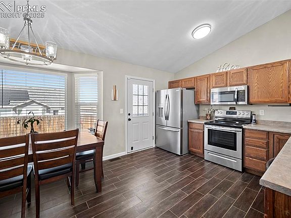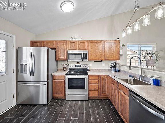 WELCOME HOME to this beautifully maintained and move in ready ranch home with main level living located in The Glen of Widefield! You will enjoy a bright and open floor plan where you can relax in the comfortable living room with vaulted ceiling that opens to the kitchen and dining area. The kitchen features a counter bar, newer stainless steel appliances, a pantry and plenty of room for the family dinner table. There is a walk out to the patio overlooking the large fenced backyard that is perfect for entertaining! Also on the main level is the master bedroom with adjoined bath and double wall closets with built-ins, there is a another bedroom and full bath. The finished basement has a large rec/family room, there are 2 additional bedrooms and a full bath. Don't miss the 3 car garage with wood shelving and *bonus* the refrigerator in garage is included, there is also a shed in the back for extra storage! It's all about location with this home, you are close to Fort Carson, parks, schools, trails, shopping, restaurants and easy access to I25!