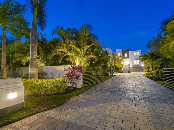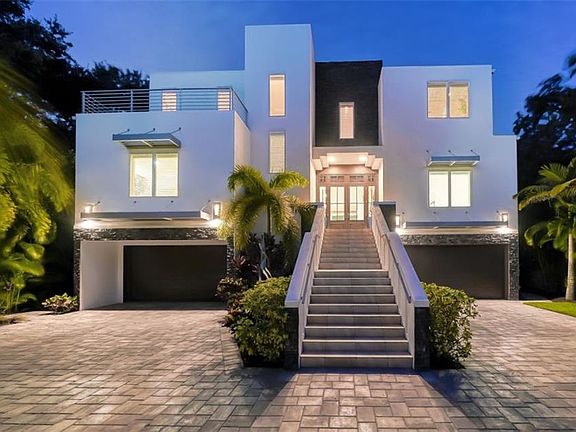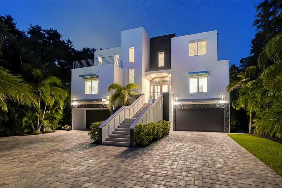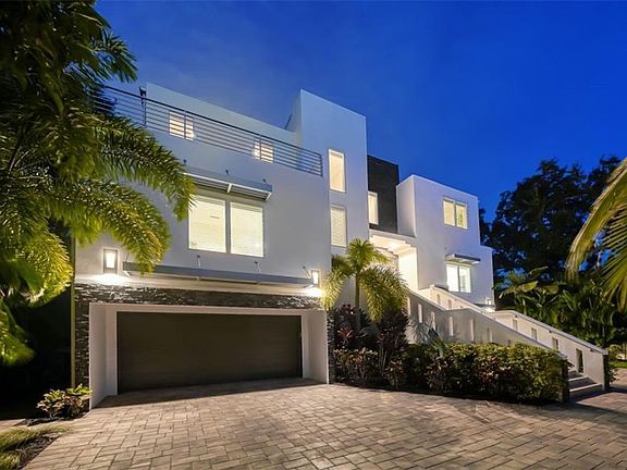 Breathtaking bay views, sleek contemporary design, & prestigious coastal comforts combine to create paradise in this fabulous Siesta Key estate. Located in Ocean View, every discerning need & preference is provided INCLUDING a 672 sq. ft. grandfathered-in one-bedroom guesthouse which is included in heated square footage. The security is unmatched as this residence was built to the enforcements to withstand the test of time with block/concrete construction including floors, stairs, impact windows & doors, remote-control blinds, completely fenced property, & beautifully designed to capture incredible sunsets throughout. You enter a flowing layout that encompasses the family room, casual dining area & kitchen enhanced by the ambiance of a gas fireplace and a wall of sliders to the ample bayfront terrace. Any chef would dream of expressing their culinary skills in the gourmet kitchen, well-equipped with an extensive breakfast bar with bar-height seating, stainless appliances including 3 self-cleaning ovens, chic cabinetry, tile backsplash, professional-grade gas range and hood, 198-bottle wine refrigerator, generous center island & wet bar. On the terrace, an outdoor kitchen allows for alfresco meals while overlooking the pool below & bay beyond. Meant to exceed your expectations for excitement, this estate grants a lifestyle of fulfillment for those who loves their toys & to entertain. There is a den that can meet any need, as well as a media room for movie nights or watching the big game, a boat dock with 16k-lb lift for cruising the Intracoastal Waterway, a full fitness gym (EQUIPMENT MAY BE PURCHASED SEPARATELY) with commercial-grade flooring, a saltwater pool featuring 8 deck jets, & garage parking for 8 cars between the main home & the detached guesthouse for the car enthusiast (all air conditioned!) The romantic master suite is a sanctuary of relaxation with sliders to the terrace, two walk-in closets & spa-like en-suite bath. There are three additional bedrooms, three and one-half baths with ultimate privacy for the whole family. The detached guesthouse boasts a full kitchen, living room, laundry closet & two-car garage. Surrounded by lush landscaping, this estate is a tropical fortress of serene solitude.