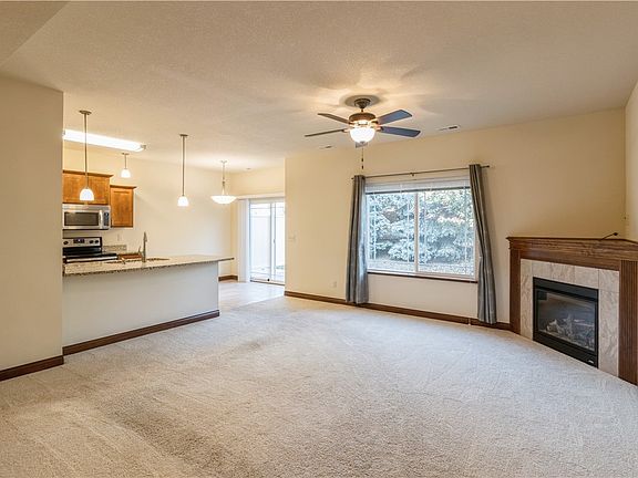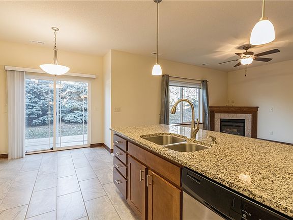 with 9' ceilings, gas fireplace. There is a large island, granite countertops, maple cabinets, & stainless steel appliances in the kitchen.