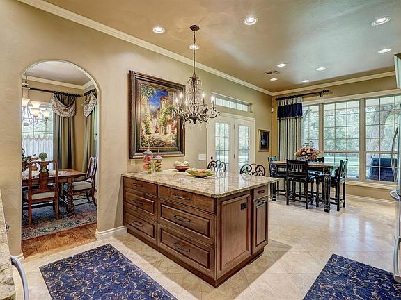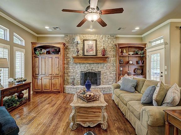 This beautiful home has been super well maintained! 1.53 acre corner lot that has trees and a wonderful outdoor area. There are 3 spacious bedrooms downstairs and one upstairs. The master bathroom and kitchen were designed by Karen Black. The master closet is by California Closets. The kitchen has a large island with seating. Dacor 5 burner gas cooktop, Dacor electric double ovens and one is convection. Farm house sink, granite countertops and high end cabinetry. The study is downstairs with french doors, a full wall of built-ins with a desk, file cabinets, shelves and storage. The spacious master has french doors that lead to the patio area. Upstairs is a large bathroom with a whirlpool tub, tankless hot water tank, double vanities and a large closet. The upstairs living area is currently used as a media room and there is a sewing/craft area. The laundry is quite large with lots of storage and a large area for folding clothes. Other features are the roof has high impact shingles, a 60 gallon hot water tank for the downstairs, full house water softener, full house water filter, wood burning fireplace has gas logs but can be wood burning, storm shelter in the garage, outdoor gas firepit on the covered patio and a built-in gas grill, plantation shutters. The green egg and the blackstone on the patio are reserved.