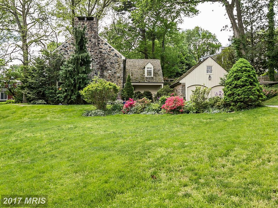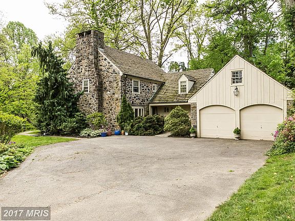 Like a stone English country house nestled in a dell! A private drive fords the Roland Run stream to this character home amidst sweeping lawns & English gardens. Covered porch leads to Foyer, cozy paneled Den w/FP, formal LR w/FP, formal DR. Amish built custom Kit w/granite & SS appliances flows to BrkfstRm. Paneled/beamed FamRm w/FP. MBR w/BA & balcony, LL RecRm, 2-car Garage, attached studio with full kitchen.