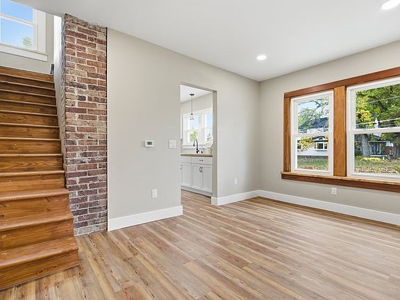 From the enclosed porch, the living room welcomes you with LVP flooring that flows throughout the main level. Leading into the dining room — the heart of the home — you’ll notice an exposed brick column, original to the house, and the staircase to the upper level, creating a warm, central gathering space.