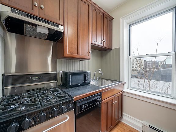 This quiet corner and oversized one bedroom home is flooded with natural light! The modern kitchen features ample storage, counter space and breakfast bar that opens to the spacious living room. The generous bedroom features 2 closets and 4 windows of natural light! Newly renovated bathroom fits the classic style of this prewar building with subway tile, pinwheel floor tile and pedestal sink. The building features a common area backyard/patio, dedicated storage space and a washer/dryer room. Located near the bus to NYC, Columbus Park, rental parking, supermarkets, shopping, & many dining options. Fantastic midtown location!!