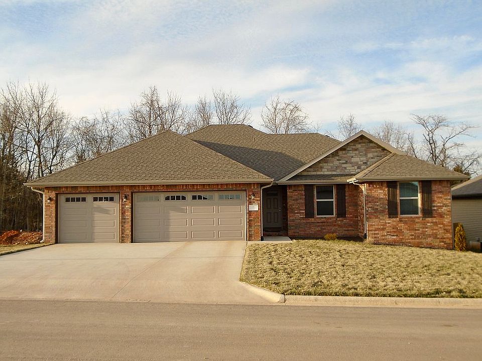 Stunning brick home in the lovely Eagle Ridge Estates that shows like a brand new home. This home offers 3 bedrooms, 2 full bathrooms, 3 car garage, over 1,883 square feet. Engineered wood flooring throughout the home with tile in the bathrooms. The open floor plan makes the home feel spacious. The kitchen has beautiful dark, 42 in. cabinets, granite countertops, an island, with all stainless steel appliances. The dining area is open to the kitchen making it an eat-in. Large laundry room off the garage. A room with glass doors sits just off the living area, perfect for a study/office space. The primary room is on the west side of the home, split from the other bedrooms. The primary bathroom has a double vanity, a walk -in shower with glass doors and a large walk-in closet. The backyard has a covered deck, partially fenced, but is very private as it backs to a wooded area. Sprinkler System.