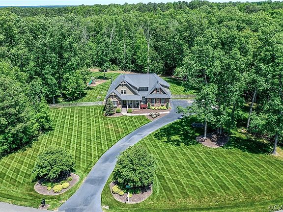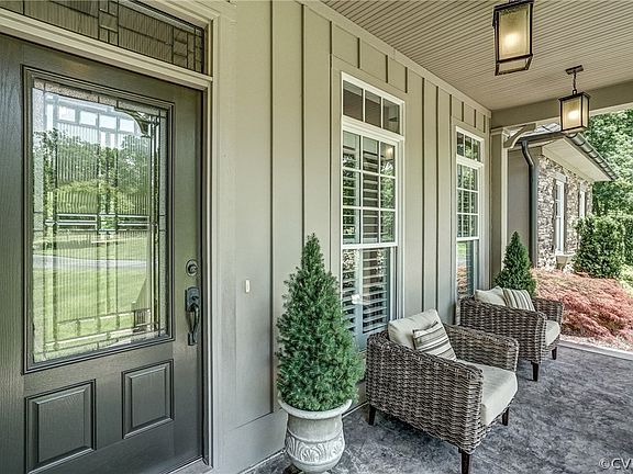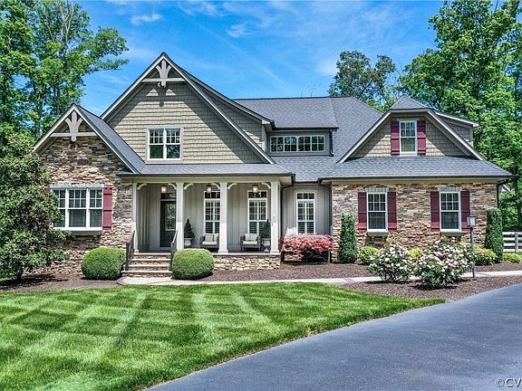 Beautiful stone and low maintenance composite siding cottage style home on 5 acres tucked away on Running Cedar Trail in Manakin Sabot near River Road West. The custom home features first floor master suite plus a first floor guest bedroom that doubles as a private study. Country front porch and vaulted rear porch with stone fireplace overlooks the expansive rear fenced yard. Hardwood floors, high ceilings and oversized windows flood the interiors with light. The large gourmet kitchen has two large center islands, gas cooking, stainless appliances and granite counters and is open to the vaulted family room with floor to ceiling fireplace and flanking base cabinets and windows. The breakfast room is large enough for a large farmhouse table. The dining room features handsome decorative wall molding. The primary suite is privately located with a huge closet. The primary bathroom has an extended length vanity, a shower with riverstone floor and linen closet. The first floor guest bedroom has an adjacent full bath ideal for visiting family members and can double as a home office. Three more large bedrooms and two baths upstairs. Two car garage, mudroom with built-in bench and hooks, pet area, pantry and adjoining laundry room. Comcast high speed internet & cable. Private paved roads. Utility expenses provided upon request. Private well and septic, liquid propane gas for cooking and fireplace. This home model was a former Parade of Homes winner for best curb appeal, best kitchen and best bath. Convenient to Hermitage Country Club, St Gertrude High School, Benedictine College Prep School, Collegiate School and Steward School.