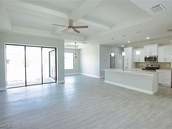 Move-in ready! Upgraded New Construction home with 3 bedrooms, 2 bathrooms and one of the largest and nicest pools in town! 32 foot long heated salt water pool with SPA, color LED lighting, automation system, glass tile, paver decking and oversized caged pool area extending 10 feet past the house footprint thanks to the oversized lot! The home features a grand 14 ft entry, paver driveway and 9'4" high ceilings throughout the rest of the home. The living room has a coffered ceiling, and the nook and master bedroom have tray ceilings that give the home a very spacious and open feel! The island kitchen comes with modern quartz countertops, white soft close cabinets & drawers along with stainless steel appliances. The main bedroom suite features two large walk-in closets and a spa-like bathroom featuring a walk-in shower, double vanity sinks and large soaking tub. This never-lived-in home is situated on the 100ft wide Shaugnessey Canal with a new seawall in place! Great central Cape Coral location, and no flood insurance required! The home has impact resistant double doors at the entrance, the remaining windows and doors are insulated only.
