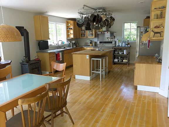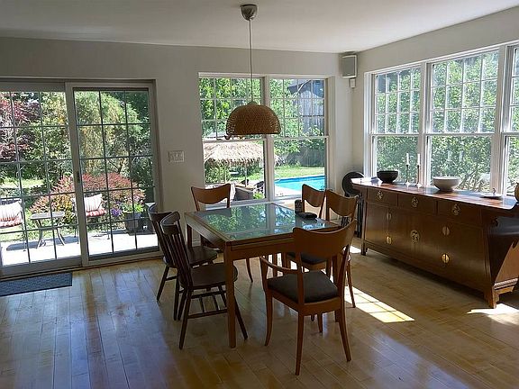 This two-story side hall colonial was built originally in 1825. We purchased it in 2002 as a two bedroom home that needed to be upgraded to accommodate our family of five. Now it is a beautiful four bedroom home with cedar siding, skylights, insulation, double glazed replacement windows, updated electricity and plumbing, and structurally solid. The spacious kitchen has stainless steel counters and appliances and a butcher block island. All four bedrooms and three bathrooms were newly built since 2002 with a luxurious steam shower in the master bathroom. The original wide plank pine floors were refurbished and reinstalled onto new subfloors. An attic space allows for extra storage. A new cement floor in the basement creates for a tidy laundry room with washer and dryer. My two favorite features include the laundry chute that has two access points, one on each floor to the basement and the intercom which allows for easy communication throughout the entire house. An ADT security system was added in 2019. The living room opens up through French doors to a three season sun porch. The garden landscaped with ornamental trees and perennials includes a beautiful stone patio and roomy deck with a view of the small mountain that the property abuts. A beautifully designed coop was newly added in 2010 to accommodate the addition of chickens to the property. The salt water pool was added in 2012. A large barn on the property can be converted to an apartment. It already has new windows, sliding glass doors, plumbing, and electricity. It includes a 3/4 bath and an outdoor shower.