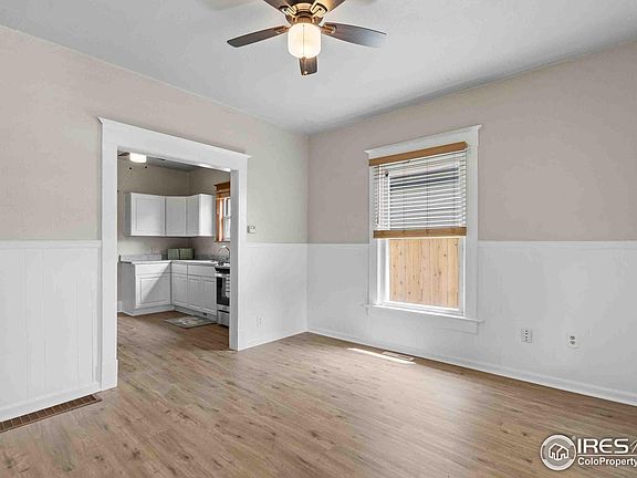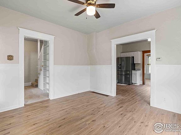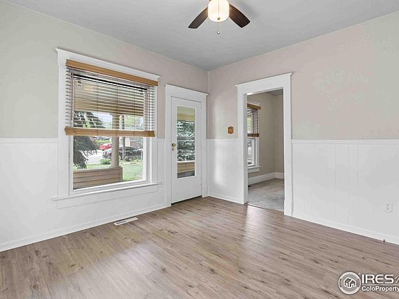 Charming Bungalow in the Heart of Old Town Wellington, close to park and restaurant, Tastefully remodeled with new eat in kitchen with plenty of counter and cabinet space, new flooring, front porch and back deck. Main level bath and bedroom with additional loft bedroom and cozy office space. Nice size laundry room. New SS appliances! The Huge garage/shop with Alley access has new garage doors and opener. Enjoy no HOA on a large lot.