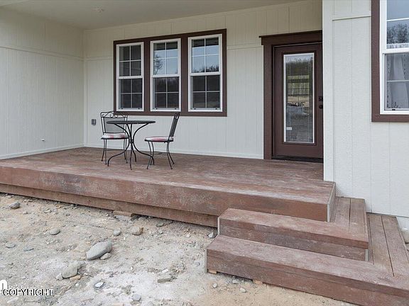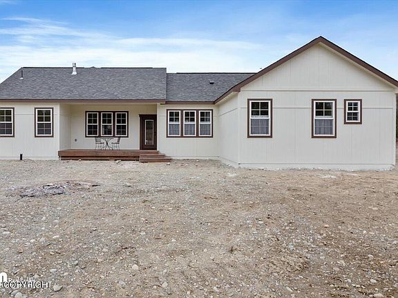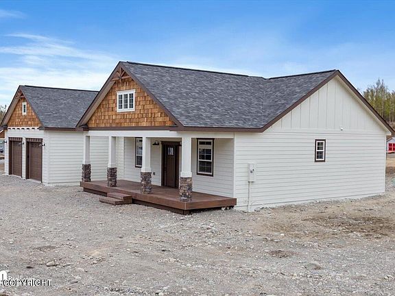 Just completed, move in ready ranch style home w/ Craftsman accents, 2060 sq ft, 3 bdrm., 2 ba., 1 acre lot, good for gardening, Great commute location & near Hatchers Pass, Rustic Hickory cabinets, stacked rock fireplace, open concept with dining and breakfast nook, master on separate wing, free standing soaking tub, large shower, potty room, exterior covered porch, trex deck, real cedar shakes.
