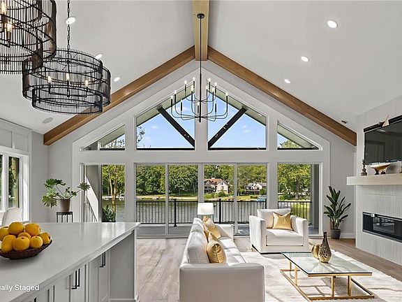 This extraordinary 4-bedroom, 5.1-bath residence combines modern design, top-of-the-line finishes, with breathtaking water views. All bedrooms are conveniently located on the main level, creating both comfort and ease of living. The heart of the home is the dramatic great room and kitchen with vaulted ceilings, featuring an impressive 15-foot island, premium cabinetry, professional-grade appliances including an induction stove top, and a back kitchen/scullery pantry area for seamless entertaining and ease of lake living.