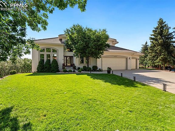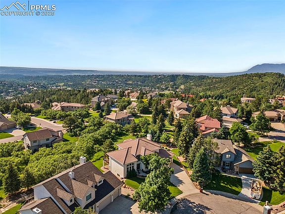DO NOT MISS THIS SHOW STOPPER IN TALON RIDGE AT PEREGRINE - this gorgeous neighborhood is tucked away on the side of the mountain but this 5 bedroom/4 bathroom stunner is a true unicorn because it's on a level (mostly flat) lot tucked at the back of a quiet cul de sac. 3 car oversized garage. Front view is of Mt. Blodgett, back views overlook city and plains. Custom Thermatrue front door, 15 ft ceilings in formal living and dining rooms. The circular flow of the main level offers effortless entertaining. Gourmet kitchen boasts high end Thermador ovens and range, Samsung refrigerator, and Bosch dishwasher, large island. There is a secondary dining area, main floor family room, a large office, powder room, and newly remodeled laundry space with dual capacity washer and dryer and built-in storage. Door off secondary dining area leads out to the large steel frame/composite deck which overlooks gorgeous backyard and serene grove of trees, again with high elevation views to the east. Upper level contains 3 bedrooms and 2 full bathrooms. The large primary suite has en suite 5 piece bath remodeled in 2020 with heated floors, soaker tub, oversized walk-in shower, and large walk-in. Lastly we head down to the lowest level which doesn't feel like a basement at all since the eastern elevation is all above ground. Huge family/media room with drop down screen/projector, wet bar w/ fridge, game room, two conforming bedrooms and another full bathroom make a perfect guest space. Walk out lower level to the backyard with flagstone patio and hot tub. Again this huge lot is mostly flat which is a rare gem in this community since most are sloped lots. Enjoy flyover displays from the Air Force Academy graduation along with daily glider exhibits. You can see all July 4th fireworks set off in along Front Range. Schools are District 20. Home has SO many addl features but character space is limited - Call listing agent for so many more details!