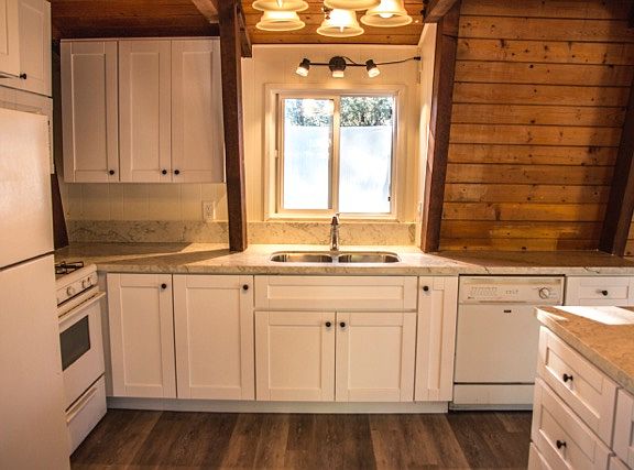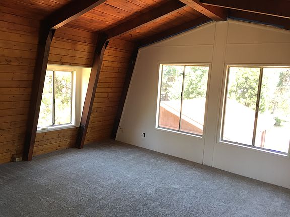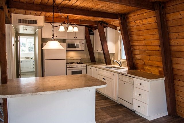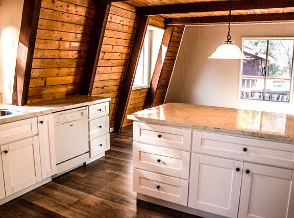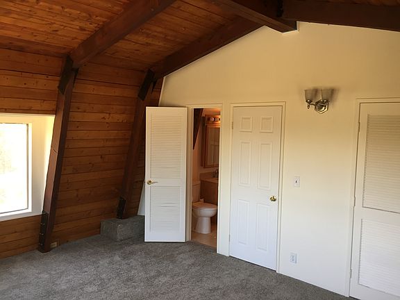 Charming and quaint 2 bedroom + large loft/additional bedroom area, approximately 1350 square feet. Master bedroom, master bathroom, and very large loft upstairs, one bedroom and full bathroom downstairs. Washer and dryer downstairs, extensive decking around the house, forced-air central heat, dishwasher, garbage disposal, microwave/exhaust fan. Newer flooring (wood-plank vinyl downstairs, carpet upstairs), newer kitchen with white shaker-style cabinets and quartz countertop and island with seating for 3, recently painted interior (no paint on any of the natural wood interior walls and ceiling areas). Over-sized 2+car detached garage with electric garage door opener, on 1/3 acre that backs to open space. $2400, available 8/16/21. 8310 Valley View Trail, Pine Valley.