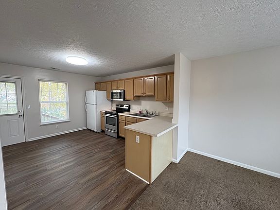The kitchen features stainless steel appliances, ample cabinet storage, and a convenient breakfast bar that opens to the living area. Durable LVP flooring runs through the kitchen and bath, while soft carpet adds comfort to the bedrooms and living space.