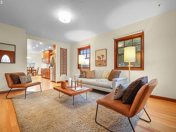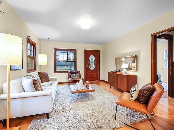 Fantastic Portsmouth bungalow just blocks to Columbia Park. Relax on covered front porch or private deck. Beautiful, peaceful fenced back yard w/low maintenance landscaping, shade trees. Great floorplan lends itself to easy entertaining: living room flows directly into updated kitchen with gas appliances. Hardwood floors and 2 bedrooms on main, plus bedroom and bonus room upstairs. Unfinished basement with dark room/canning room space is clean and ready for your creative ideas. A must see! [Home Energy Score = 3. HES Report at https://rpt.greenbuildingregistry.com/hes/OR10206379]