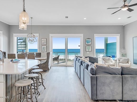 Welcome to Stay Salty, a Gulf-front luxury home located in one of the most desirable and peaceful stretches of Panama City Beach. Offered fully furnished and professionally designed, this extraordinary coastal residence delivers over 5,600 square feet of refined living space across four levels, with seven spacious bedrooms and seven and a half bathrooms. Built with longevity and comfort in mind, the home features hardwood, luxury vinyl plank, and tile flooring throughout—no carpet—and includes carefully selected furnishings, artwork, lighting, and decor that complement its elevated coastal style.