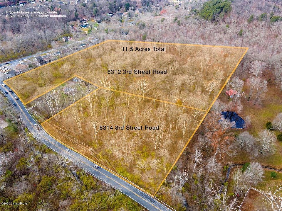 11.5 acres with approximately 650+ feet of road frontage located along 3rd St Rd just north of Arnoldtown Rd and just south of Outerloop. There are two parcels and both are being sold together to make up the 11.5 acres. 8312 is the larger parcel on the south end of the property, it has less road frontage, 8314 is the smaller parcel but has a much larger road frontage and is on the north end of the property. There is a home in the middle of the road frontage that is not part of either parcel. Per seller electricity and water are on the property where a home was located at one time.