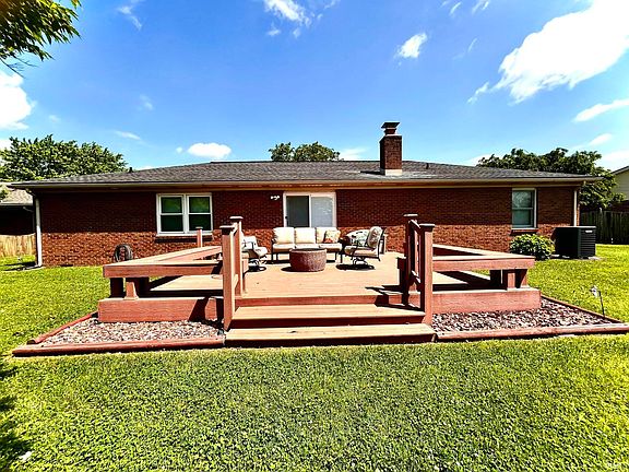Beauty, quality, and spaciousness is what you will find in this pristine 3 bedroom 2 bath all brick home with picturesque lake views from the tranquil backyard with large deck on Eastside of Evansville. As you enter the home you will notice gorgeous hardwood floors leading to two separate living areas with a brick fireplace and abundant natural light filled family room, just right for entertaining or family time, that is open to the spacious dining and kitchen area outfitted with new stainless appliances and abundant cabinet/counter space. The split bedroom design offers a private primary bedroom retreat with an ensuite bath and walk in closet. 2 additional bedrooms and full guest bath are located on the other side of home. Recent updates include new HVAC, flooring, windows, and Trex deck enhancing the home's value and appeal. The oversized garage has built in cabinets, pull down stairs for attic access, and a service door. This home is ideally located on a quiet cul de sac within close proximity to schools, shopping, and dining!