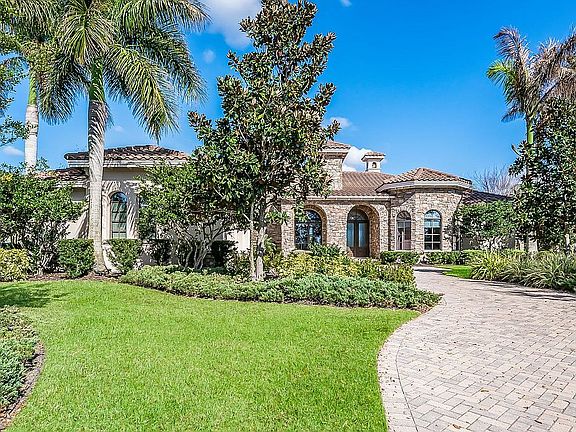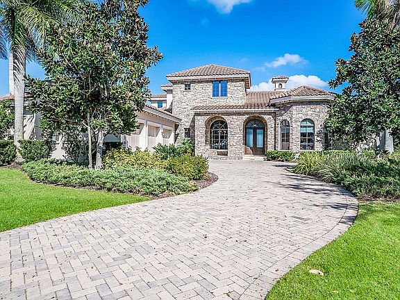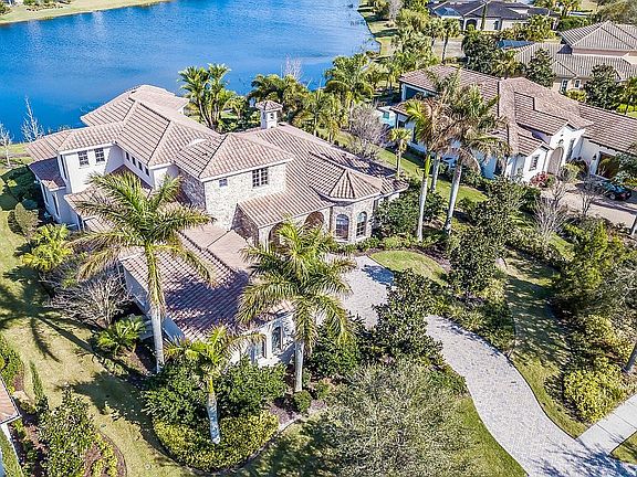 Stunning Marc Rutenberg custom built home situated on a gorgeous lake lot. Spectacular stone elevation. Striking sunrises. The Tuscan community of The Lake Club offers full amenities. This two-story home has five bedrooms, four baths. Enter through double glass doors into the spacious entry. The living area has a gas fireplace with granite and wood trim. French doors with glass side panels and built-ins. Crown details throughout. Gorgeous granite kitchen, custom wood cabinets, a BlueStar 48" range, Viking appliances. Stone backsplash. Grand islands with prep sinks, wine refrigerator. Desk area. Lovely dining area with a large window. Gathering room off kitchen also has French doors that overlook the salt water pool, spa and grotto / waterfall. Sizeable den with bay window, Mahogany wood floors, built in book shelves. Back room bonus room has fabulous lake view. The owner's retreat is exquisite with space and style. Impressive windows that bring in the natural lighting. Owner's bath offers garden tub, dual vanities and two walk-in closets. A private water closet and walk in shower. Upstairs is a colossal bonus area with wet bar. Great use of space such as a work out area, media room etc. Large walk out balcony with an amazing lake view. Outdoor kitchen with stone columns and expansive paver lanai. Iron gate fencing around yard. This community has so much to offer.